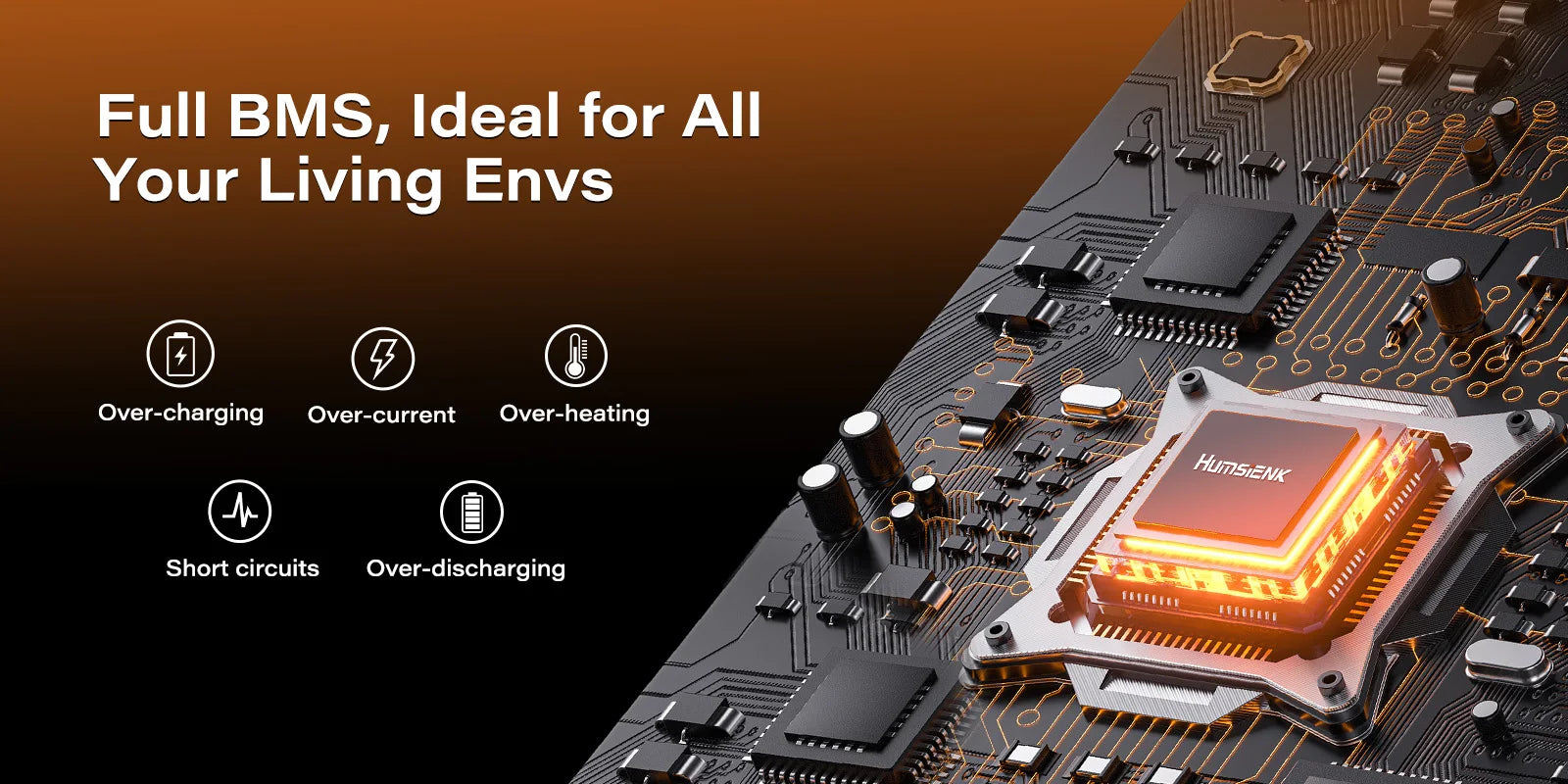 The advanced 200A BMS ensures high efficiency and safety with multi-protection function, including overcharging, overdischarging, overloading and short circuit.