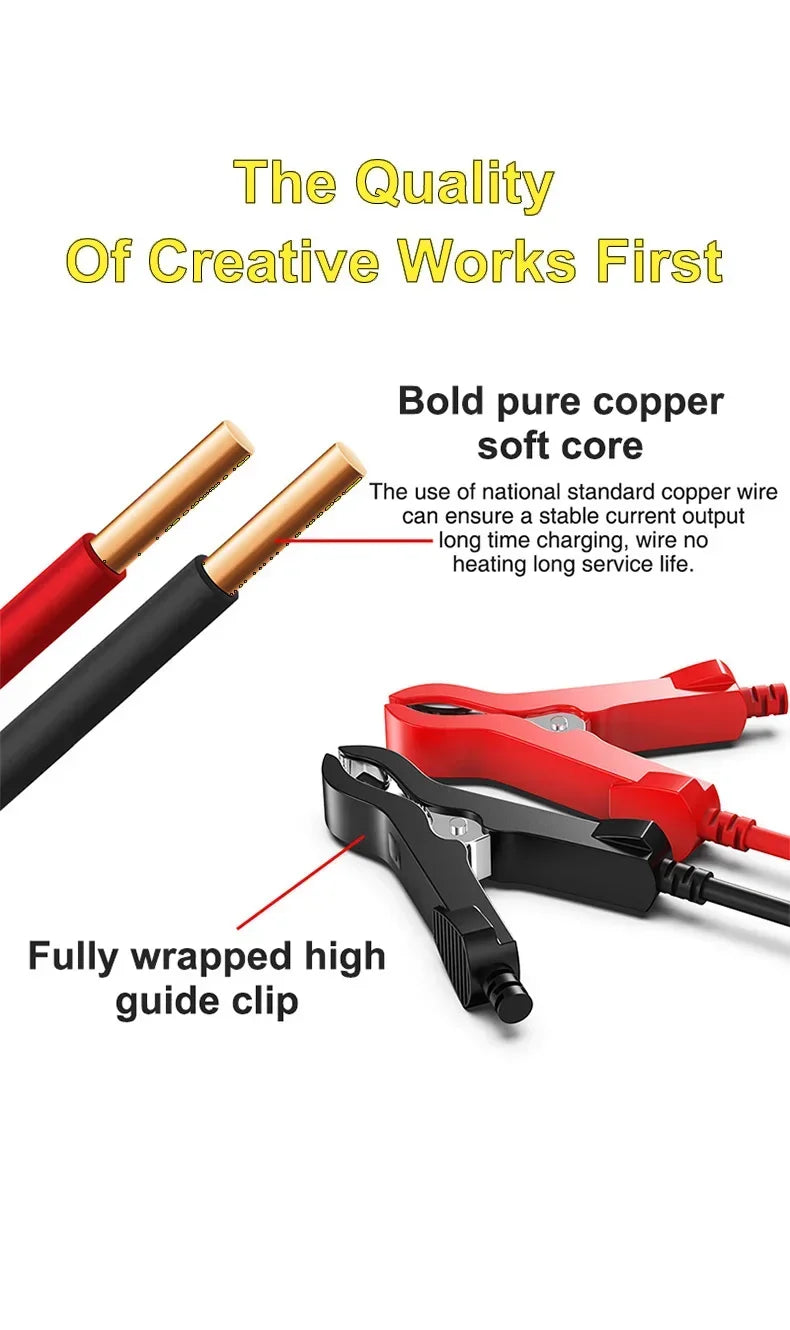 Built with bold pure copper soft core and national-standard copper wires to ensure stable current output, long charging durations without overheating, and extended service life. Fully wrapped high-conductivity clamps enhance safety and reliability.