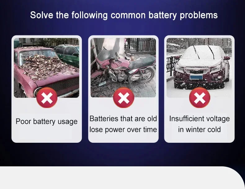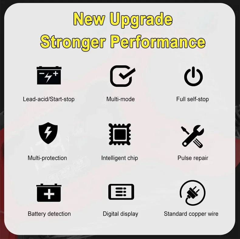 Equipped with an intelligent chip and pulse repair technology to detect battery status, automatically recognize and protect the battery, ensuring safe and efficient charging with full self-stop functionality to prevent overcharging.
