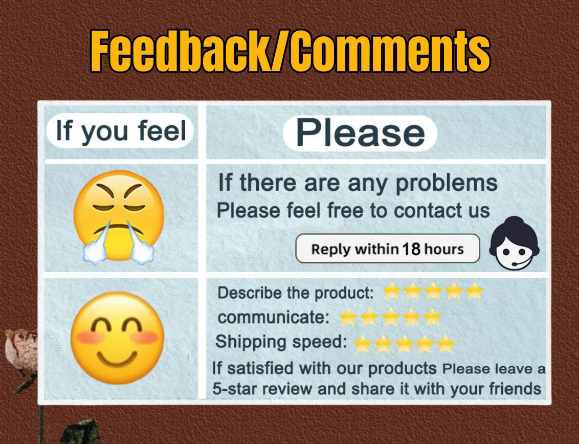 1.If you satisfied with our products and service, please leave your positive feedback and 5 stars, You can share your pictures in positive feedback, and we will send you a coupon or a gift.
