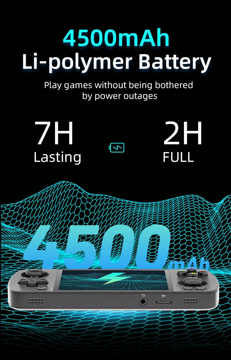 Li-polymer battery 4500 mAh, charging 2hours, battery life 7 hours