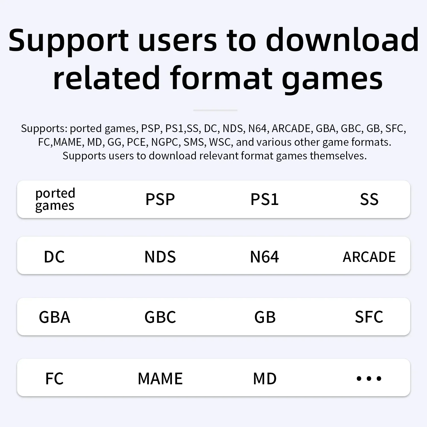 Games Supports: ported games, PSP, PS1,SS, DC, NDS, N64, ARCADE, GBA, GBC, GB, SFC, FC, MAME, MD, GG, PCE, NGPC, SMS, WSC, and various other game formats. Supports users to download relevant format games themselves.