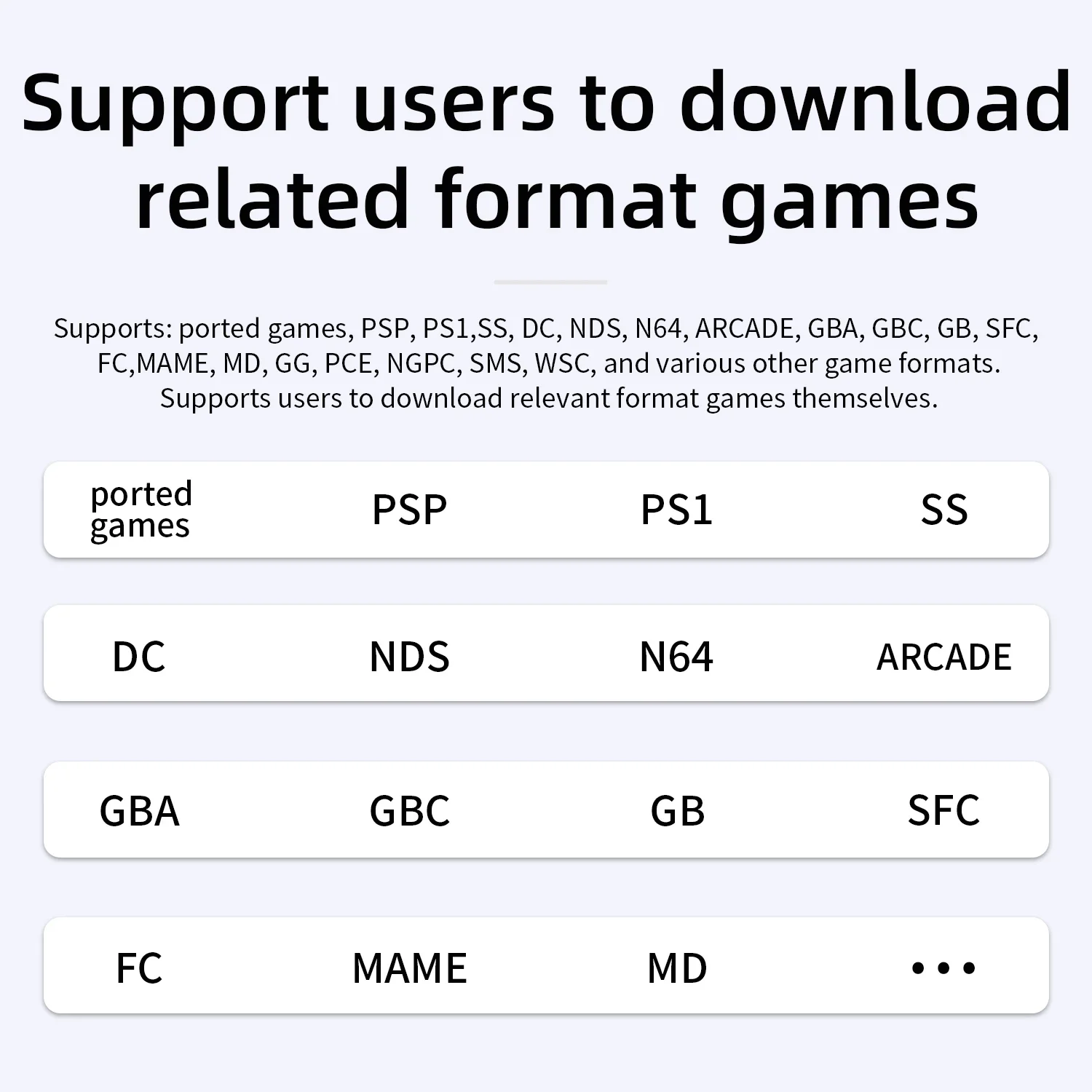 Supports: ported games, PSP, PS1,SS, DC, NDS, N64, ARCADE, GBA, GBC, GB, SFC, FC,MAME, MD, GG, PCE, NGPC, SMS, WSC, and various other game formats. Supports users to download relevant format games themselves