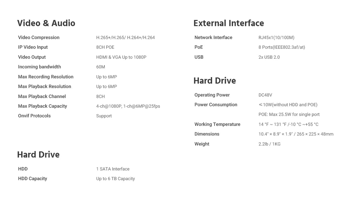 The whole CCTV IP system supports H.265+ coding, providing fast stream without latency & saving storage space. ONVIF & RTSP protocols help the system work with all ONVIF devices & third-party software, like Blue Iris, Synology, etc.