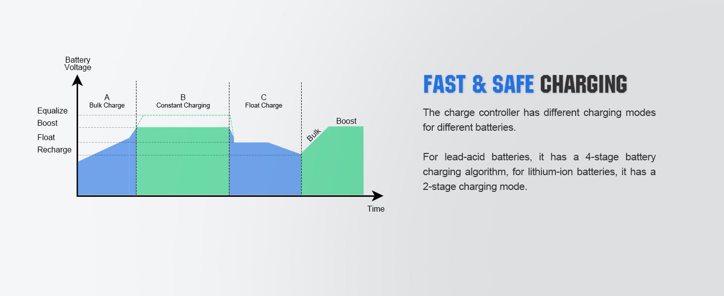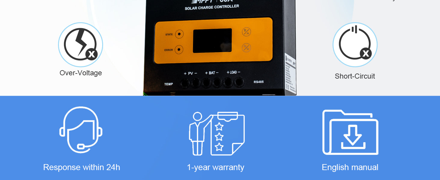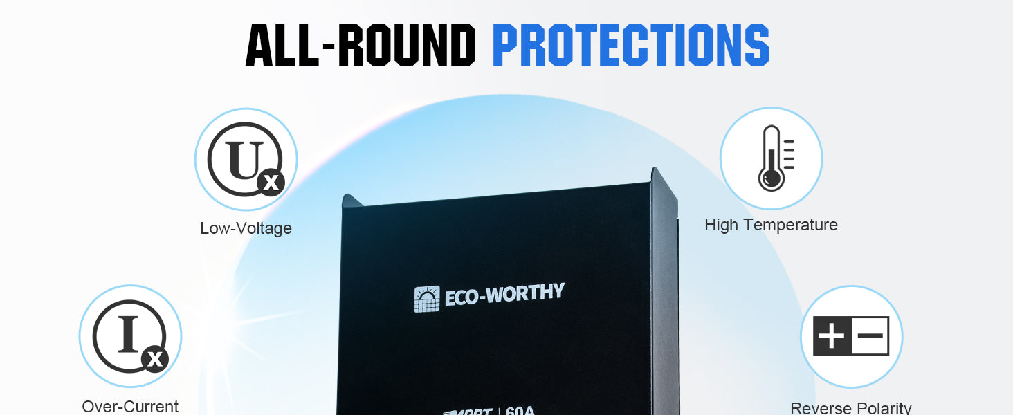 It has multiple protections to prevent those circuit issues, including Reverse Polarity, Short-Circuit, High Temperature, Over-Current, and Over-Voltage/Low-Voltage. Prevent explosions and fire conditions, keep the controller safe during working