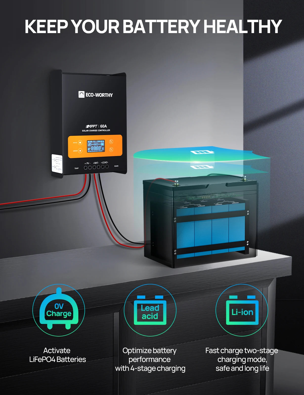 ECO-WORTHY 60A MPPT Solar Charge Controller, 12/24/36/48V Solar Panel Regulator for Lead-Acid/Lifepo4 Battery in Solar System RV