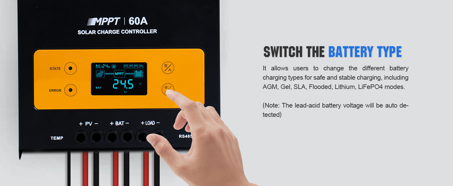 Equipped with OLED screen, which can dispaly the status of PV voltage, battery voltage, charging current, charging power, and the button can be used to change the battery's type