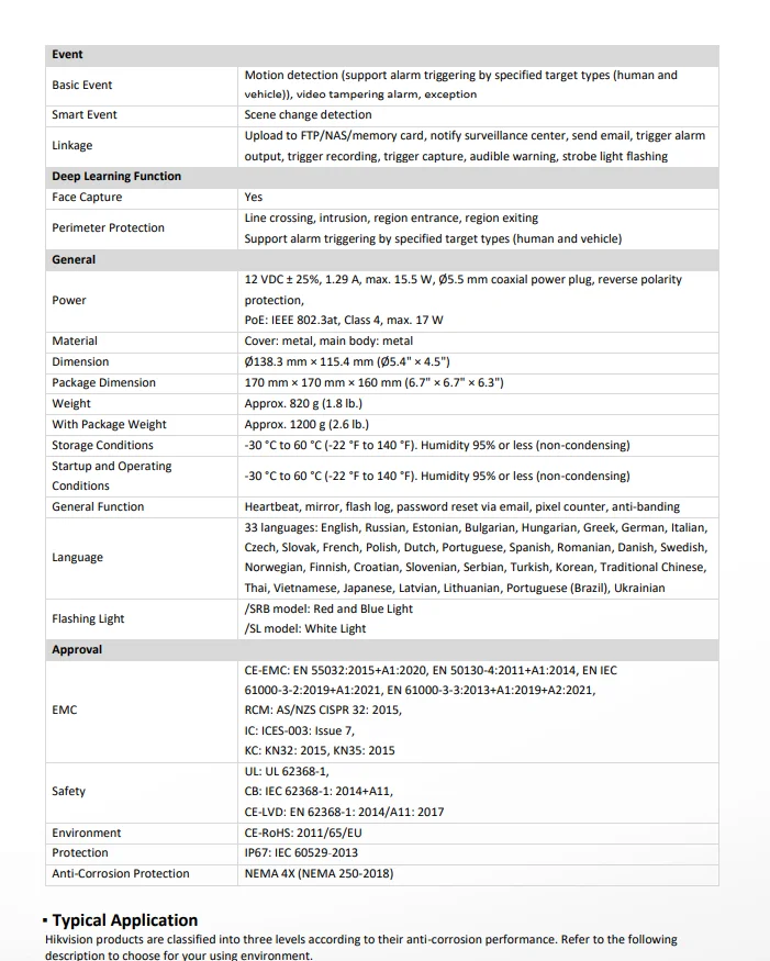 LinkageUpload to FTP/NAS/memory card,notify surveillance center,send email,trigger alarm output,trigger recording,trigger capture,audible warning,strobe light flashing