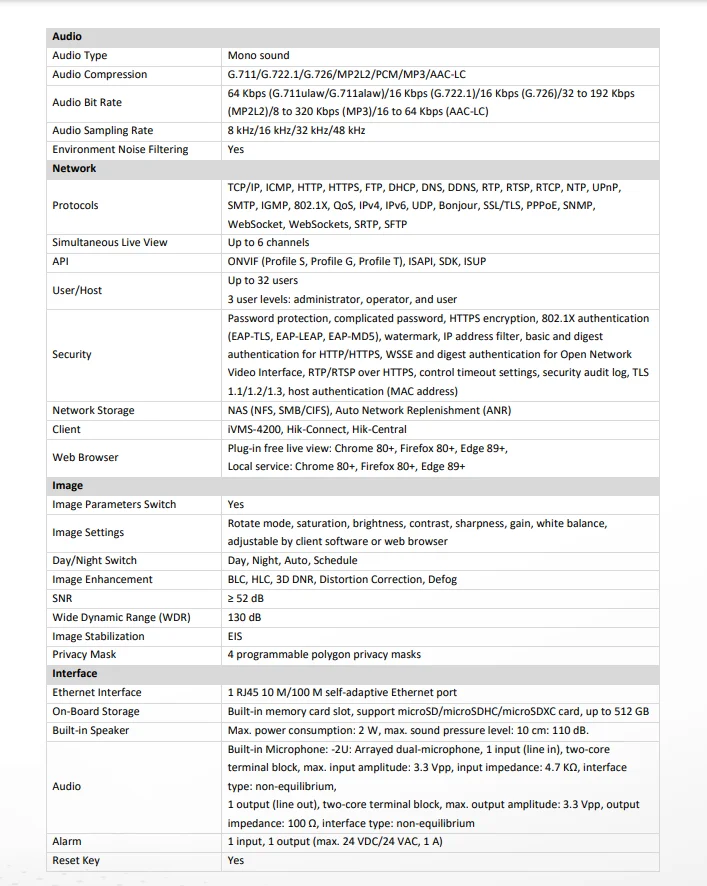 ProtocolsTCP/IP, ICMP, HTTP, HTTPS, FTP, DHCP, DNS, DDNS, RTP, RTSP, RTCP, NTP, UPnP, SMTP, IGMP, 802.1X, QoS, IPv4, IPv6, UDP, Bonjour, SSL/TLS, PPPoE, SNMP, WebSocket, WebSockets, SRTP, SFTP