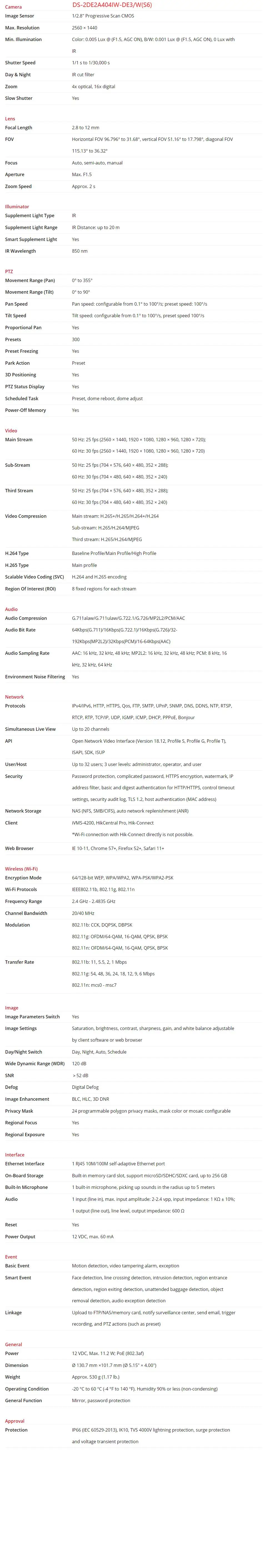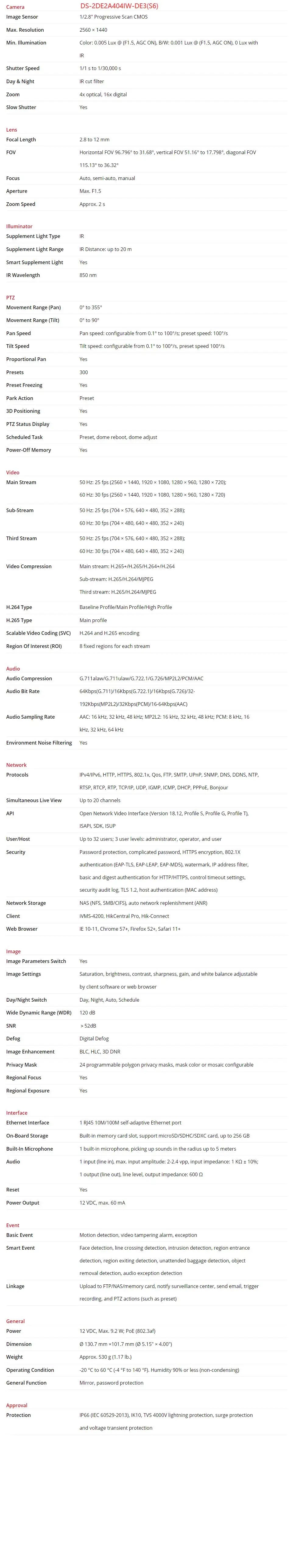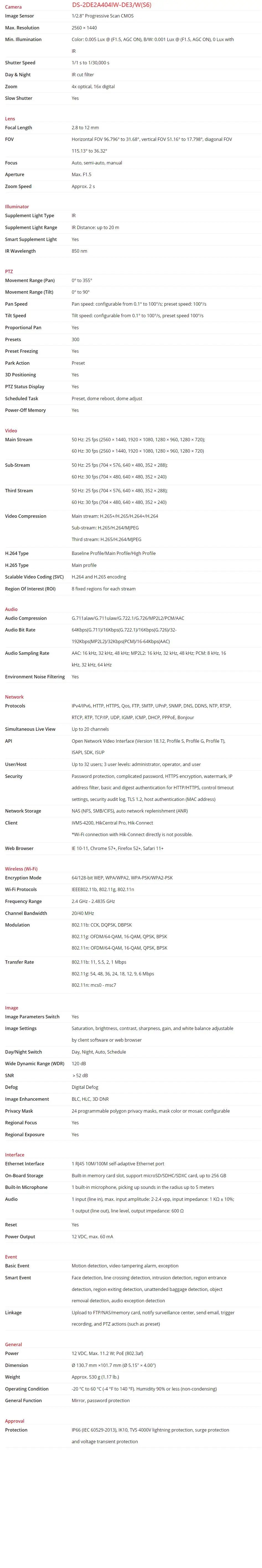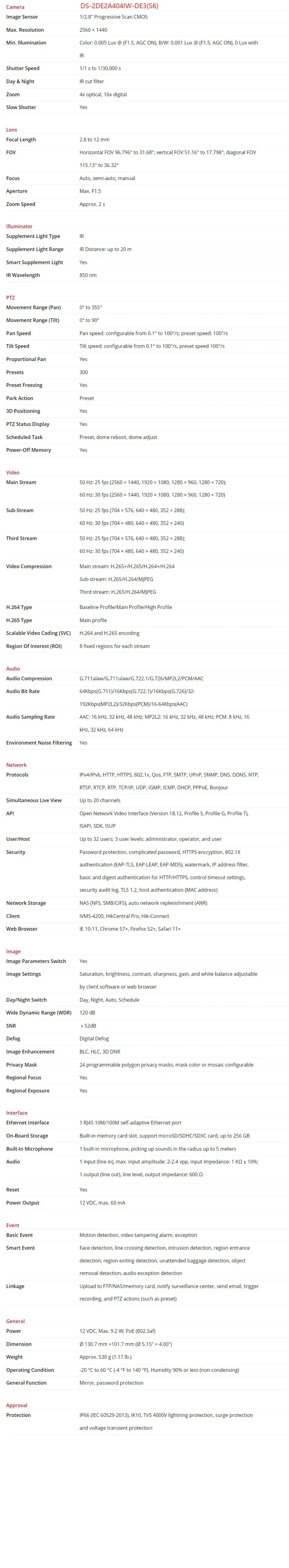 Hikvision DS-2DE2A404IW-DE3 4MP 4X Optical IR NO WiFi Dome PTZ POE Network IP Camera Face detection IK10 Powered-by-DarkFighter