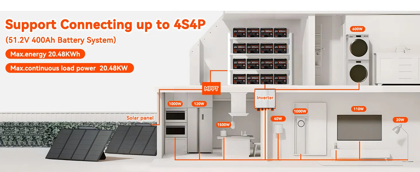 Easily connect up to 4 batteries in series or parallel, achieving a total capacity of up to 20.48kWh. Customize your power solution to suit your needs.