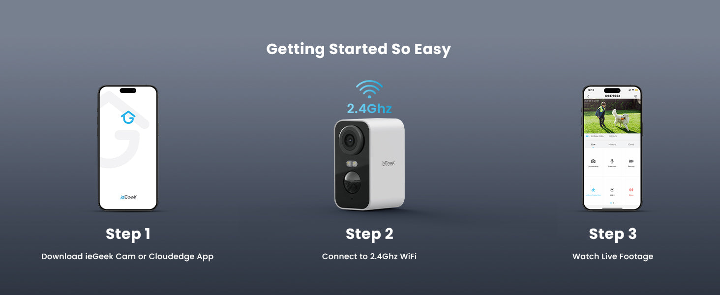 • Easy to Install in 1 Minutes & 100% Wireless & Rechargeable - ieGeek security cameras wireless outdoor comes with a professional rechargeable battery and compact design, no need to run cables, very convenient, easily to install in 1 minute and connect in 10 seconds, can be used both indoors and outdoors. Not support 5GHz wifi.
