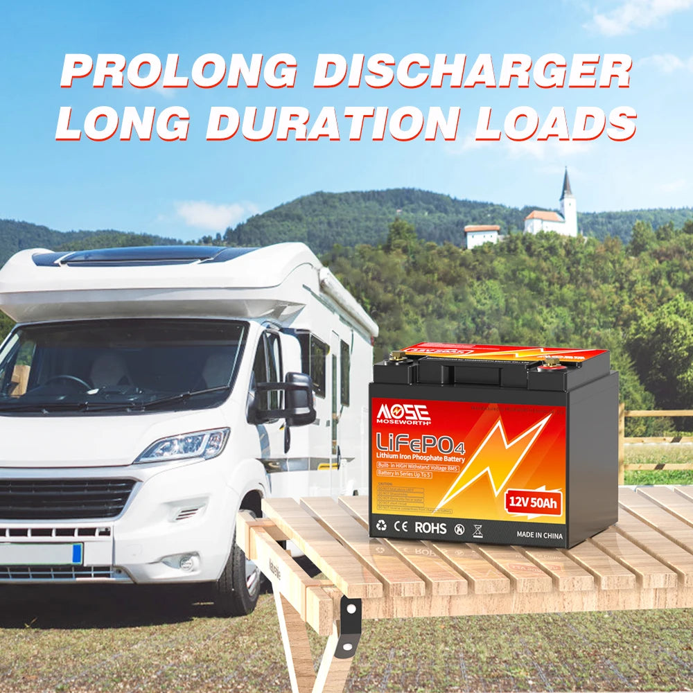 MOSEWORTH 12V 50Ah LiFePO4 Battery 50A BMS 640W Rechargeable Lithium Iron Phosphate Battery Deep Cycle Low-Temp Protection
