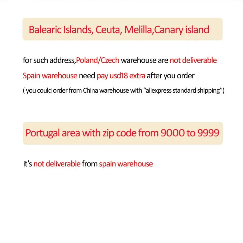 • Order from Spain warehouse to Balearic island/canary island/melilla/Ceuta need pay extra,if you order, pls wait us to increase the total amount by about usd18 before you pay the order