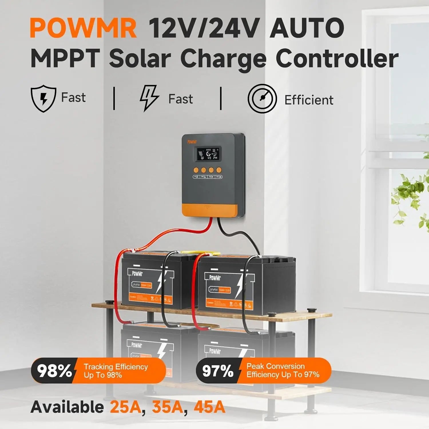 【Advanced MPPT Technology】MPPT Charge Controller has advanced maximum power tracking (MPPT) technology with tracking efficiency up to 98% and 97% peak conversion efficiency, maximizing solar panel output and improving charging efficiency
