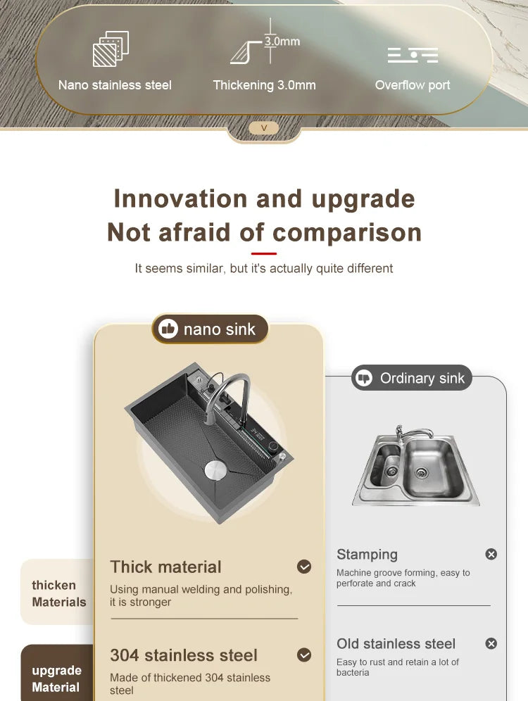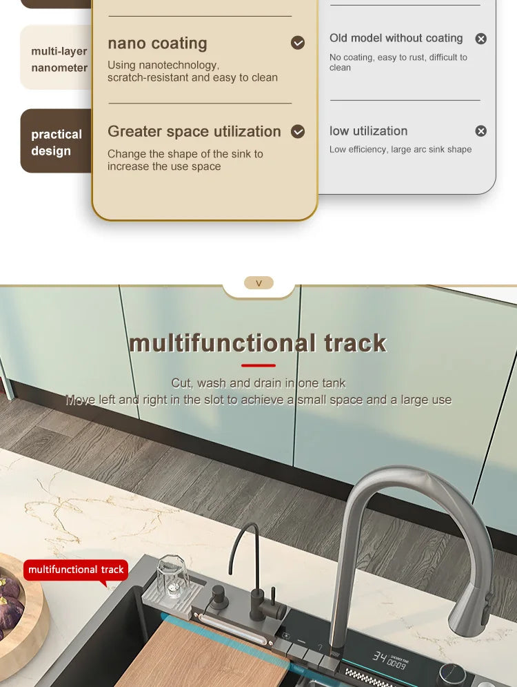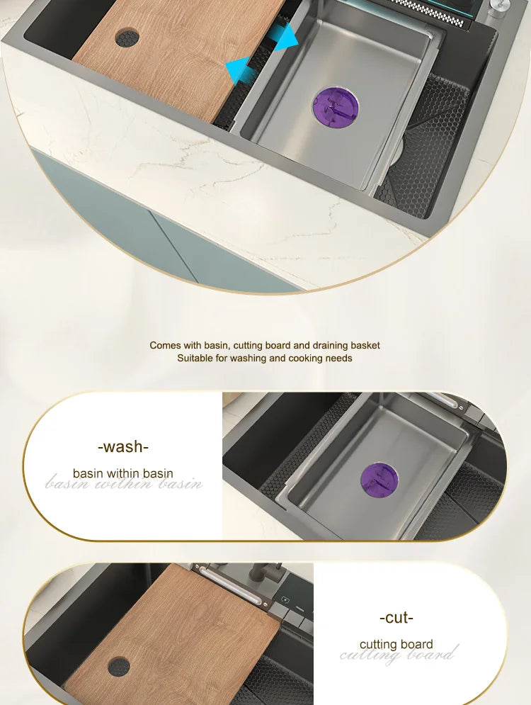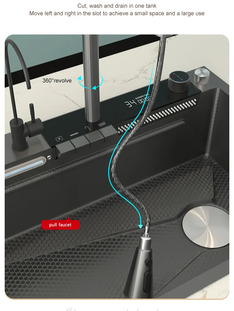 Stainless Steel Waterfall Kitchen Sink Large Single Slot With Digital Display Faucet Apartment Multifunctional Wash Basin