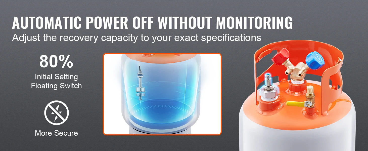• Automatic Power-off: The SucceBuy refrigerant recovery tank is equipped with a floating switch. The initial setting is to automatically power off and suspend when 80% of the capacity in the tank is recovered. You can also set it by yourself to effectively control the recovery capacity. The entire recovery process does not need to be watched.