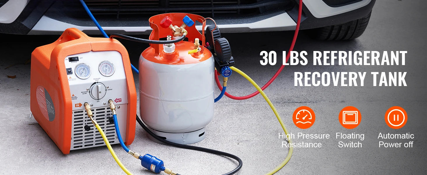 • Reusable Recover Tank: The tank body is crafted from durable HP295 steel with a sturdy 0.1-inch wall thickness. Its sleek high gloss powder coating and reinforced steel seal make it resistant to wear, even after extended use.