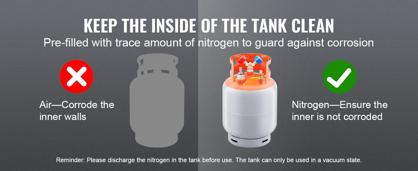 The SucceBuy refrigerant recovery tank is filled with nitrogen before leaving the factory, which is different from the air filled with other products, effectively ensuring that the tank interior is not easy         to oxidize and corrode. Please discharge the nitrogen filled in the tank before use. The tank can be used only when it is in vacuum.