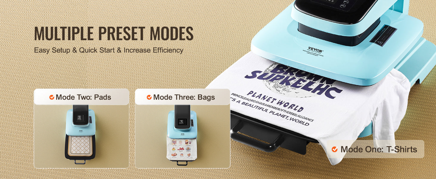 The heat press features three major modes for quick selection: Pads, T-shirts, and Canvas Bags. This reduces operation time significantly, making it beginner-friendly without needing in-depth temperature and time settings.