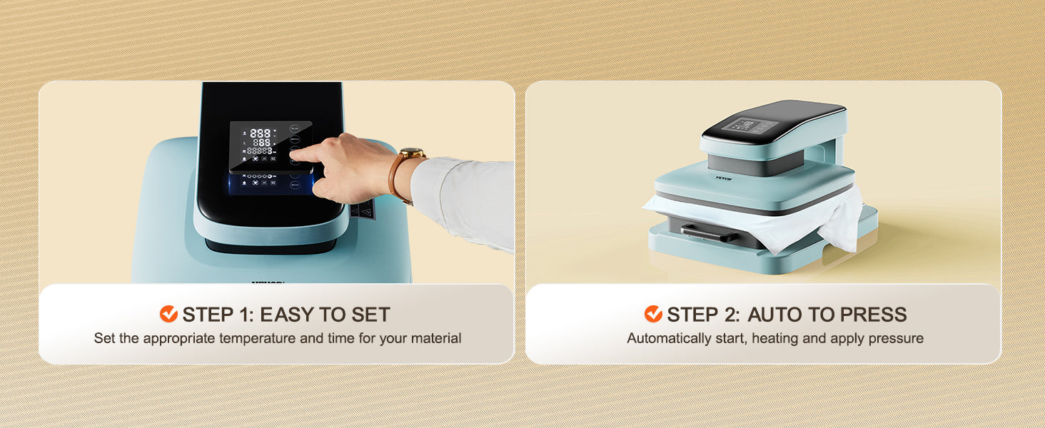 Our auto heat press machine frees up your hands. With a gentle press, the machine automatically lowers for pattern transfer and rises on its own after completion. No need for manual pressing, making it even more effortless.