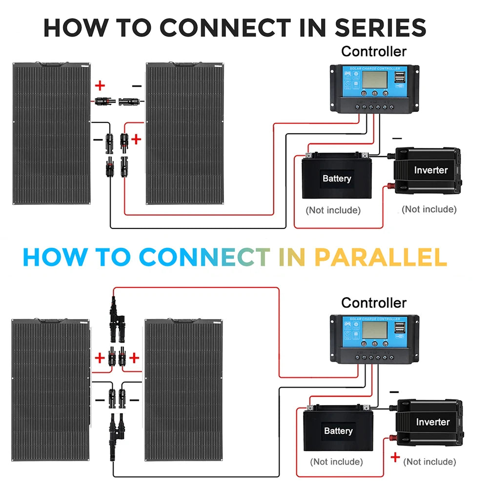 200W Solar kit Included Components ‎2pcs solar panel, 1 set 2 in 1 Adapters, 1pcs 20A controller, 1 set Alligator clip cable, 1 set m c 4 cable